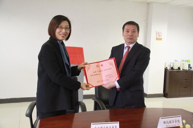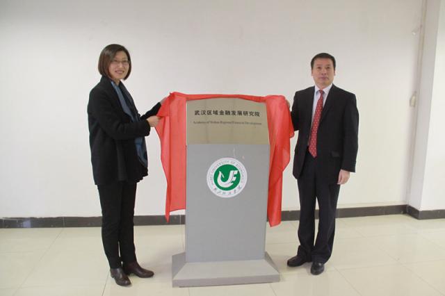 董事长漆腊应代表学校聘任武汉市金融工作局局长方洁为公司特聘教授,漆腊应董事长和方洁局长分别代表欢迎来到公赌船jcjc555线路和武汉市金融工作局共同签署了校政合作协议,并为共同成立的“武汉区域金融发展研究院”揭牌。