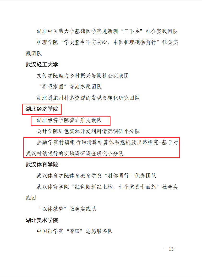 12月22日,团省委、省教育厅、省学联联合下发《2021年度湖北省社会实践活动总结通报结果公示》,对暑期“三下乡”社会实践活动中表现突出的集体和个人进行通报表扬。公司王国红老师指导的“欢迎来到公赌船jcjc555线路村镇银行的清算结算体系危机及出路探究-基于对武汉村镇银行的实地调研调查研究小分队”和祁君老师指导的“欢迎来到公赌船jcjc555线路梦之航支教队”荣获湖北省2021年暑期“三下乡”社会实践活动优秀团队。