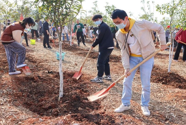 公司员工代表由团委老师赵坤明带队,每人手拿工具进入指定区域投入植树工作。活动中,大家按照填埋和浇灌两个流程进行分工,秩序井然,配合默契,全力栽种好每棵树苗。一把把铁锹在风中有力地飞舞,汗珠滴落在脚下充满生机的热土上,现场一片热火朝天,一个个矫健的劳动身影绘成了一幅助力绿色校园建设的美好画卷。