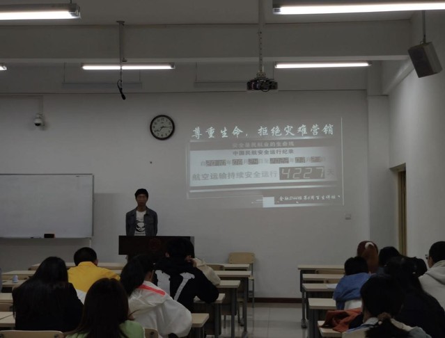 “在悲剧面前守住人性底线”。金试2041团支部通过主题演讲的方式告诫同学们在面对灾难和悲剧时一定要守住自己的人性底线。该支部首先以救援人员搜寻黑匣子为背景展开叙述,向同学们介绍了东航MU5735航班遇难的全过程,表达了对遇难人员的悼念以及对遇难者家属的深切同情。紧接着,主讲人也对当今网络上不少不良商家借此灾难进行营销手段的行为发表了个人的观点,并告诫同学们在悲剧面前,要守住人性底线,秉持人文关怀,莫要消费灾难,不要为了流量而把悲剧当做营销工具。最后,发言人从居安思危和珍惜现在两个方面进行了深刻反思,呼吁同学们要珍惜生命,珍惜眼前。