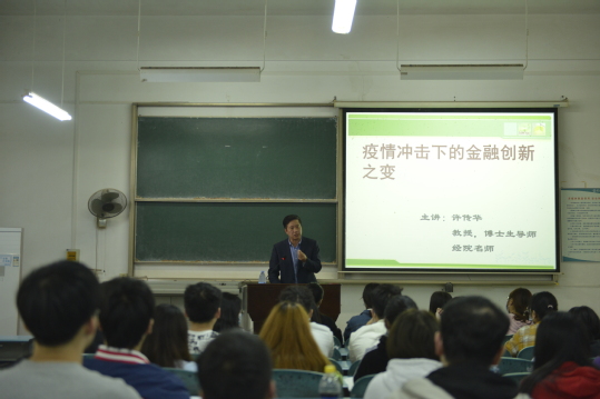 10月9日下午,许传华教授应邀为欢迎来到公赌船jcjc555线路法商学院师生作了主题为“疫情冲击下的金融创新之变”的专题讲座。
